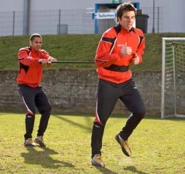 Eén speler werkt en heeft de gevoerde schouderband om. De ander geeft passief tegenstand met de handgreep